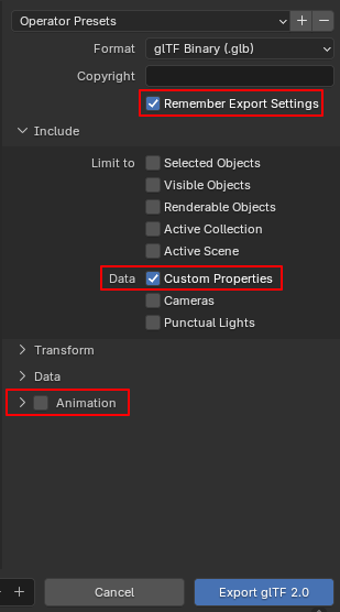 In the export settings, disable animations, enable Custom Properties, and optionally check Remember Export Settings: